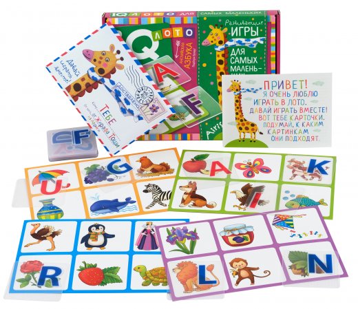 В наборе 4 картонные карты, 27 прозрачных карточек и конверт, в котором ребёнок найдёт письмо от жирафа Тоши, а взрослые — инструкцию.