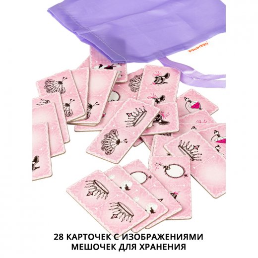 Красочная игра для детей на внимательность. Играть в неё весело и совсем несложно. В комплект входят 28 карточек с изображениями в стиле ретро: короны, духов, зеркальца, веера, туфельки и пуделя.
