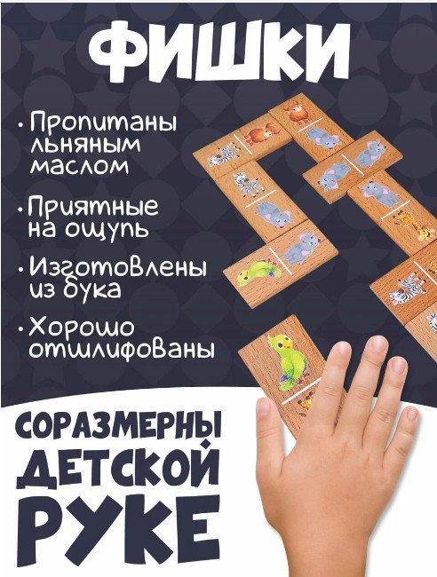 Домино из массива бука пропитанного маслом с яркими рисунками животных экологично и безопасно для самых маленьких.