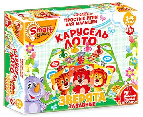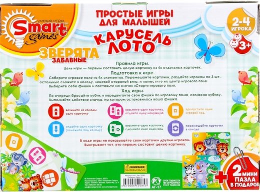 Карусель лото Забавные зверята Умные игры – от компании Smart Games носит развлекательный характер. Это простая игра для малышей с игровым полем в виде карусели. В ходе игры ребенок познакомится с окружающим миром. В нее можно играть небольшой компанией. Также ее обладатель получит два мини-пазла в подарок. Это занимательная игра на основе классического лото. Игроки, по очереди, бросают кубик и делают ход. Цель игры - первым составить целую картинку из фрагментов.