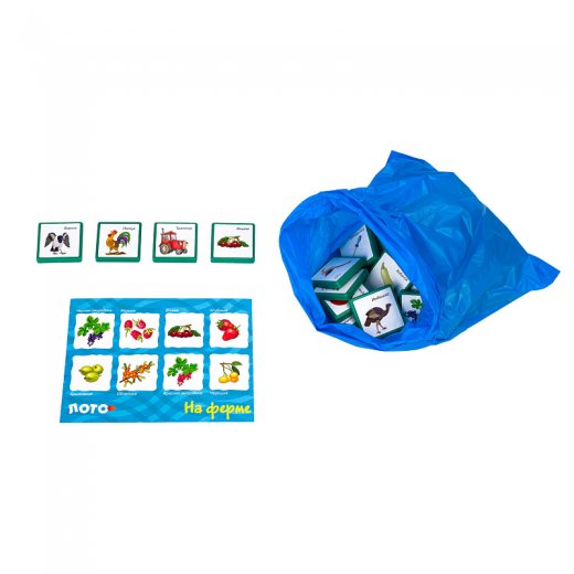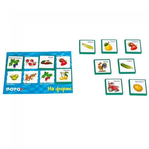 Лото «На ферме» знакомит с разными животными, которых ребёнок может увидеть в деревне. Правила игры схожи с классическим лото, но вместо бочонков с цифрами в комплект входят карточки с картинками.