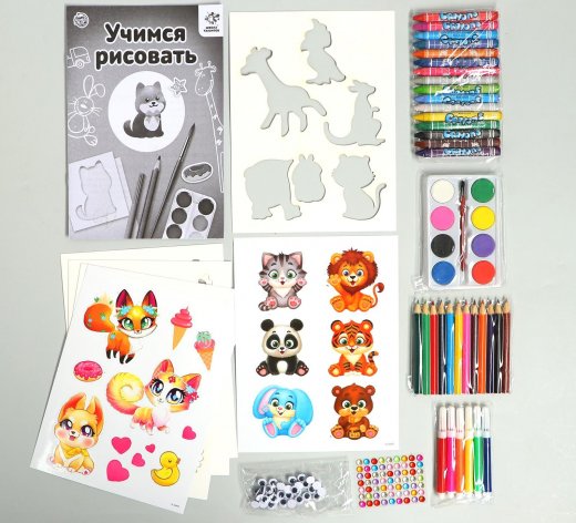 Состав набора: 15 восковых карандашей, 12 цветных карандашей, 6 фломастеров, 4 листа трафаретов, 2 листа наклеек, липкие глазки, декор.