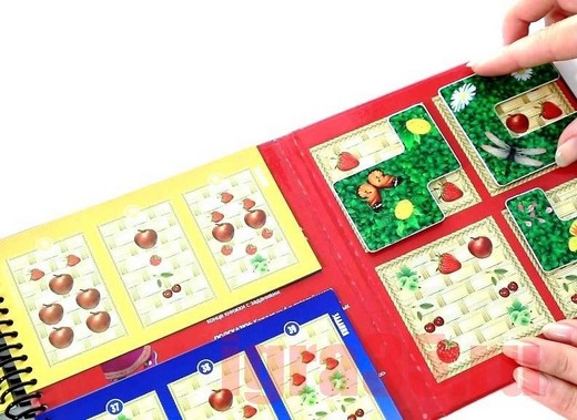 Сначала выберите карточку с заданием и посчитайте, сколько и каких ягод на ней изображено. Затем расположите 4 магнитных элемента на игровой доске таким образом, чтобы скрыть все плоды, кроме тех, что указаны в задании.