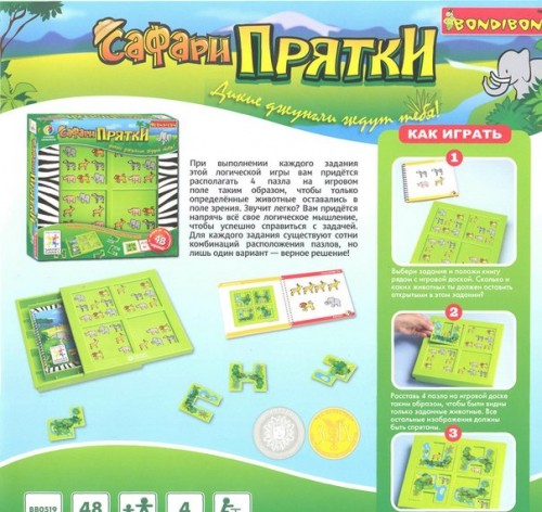 Логическая игра "Прятки Сафари Bondibon" предлагает ребенку принять участие в увлекательном сафари. И это не просто путешествие! Это целое приключение в котором ребенку нужно будет проявить свою изобретательность и смекалку, чтобы победить! Здесь он будет иметь возможность встретить множество необычных животных, с которыми ему предстоит иметь дело. Игра развивает логическое мышление, воображение, аналитическое мышление, абстрактное мышление, пространственное мышление, комбинаторное мышление (нужно складывать вместе несколько фактов), целеустремленность, аккуратность, терпение, усидчивость, память, интеллект, фантазию, умение познавать с удовольствием. Играйте в самые лучшие головоломки! "Прокачивайте" интеллект!