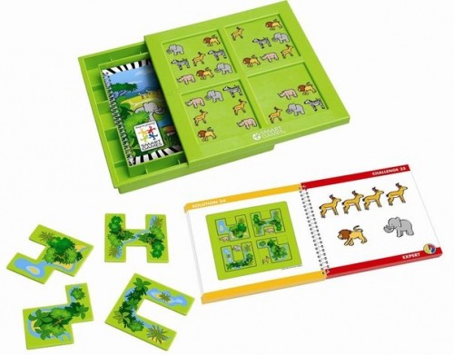 Выбери задание. Расставь 4 пазла на игровой доске таким образом, чтобы были видны только заданные животные. Все остальные изображения должны быть спрятаны. Существует только один вариант решения. Ответ находится в книге с заданиями. Игра имеет 4 уровня сложности. В заданиях уровня «НОВИЧОК» ты можешь воспользоваться подсказками. В нижней части страницы книги показано, как должны располагаться пазлы. Со следующими заданиями игрок должен справиться самостоятельно.
