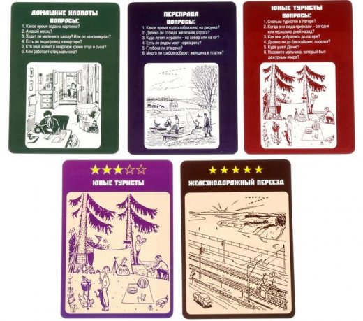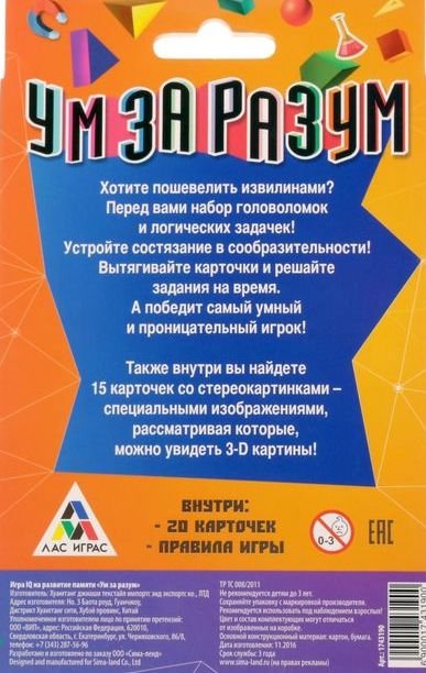 Состав: 20 карточек с логическими задачками и стереокартинками, правила игры.