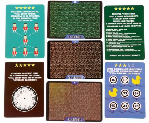 По очереди вытягивайте карточки и выполняйте задания за отведённое время. Тот, кто первым справится с ними, останавливает время и сверяет свой ответ с правильным. Если они совпали, то игрок забирает карточку себе в качестве победного очка.