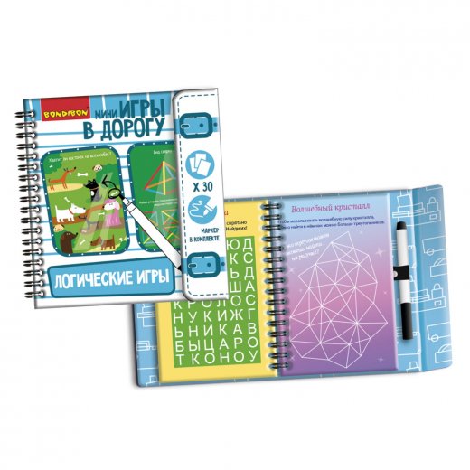 "Логические игры" от бельгийского бренда Bondibon - это блокнот, в котором собрано множество развивающих игр для детей. В комплект также входит маркер, с помощью которого можно будет решать задачи и головоломки и отмечать правильные ответы. Поверхность карточек обладает стирающимися свойствами. Можно играть и рисовать снова и снова!