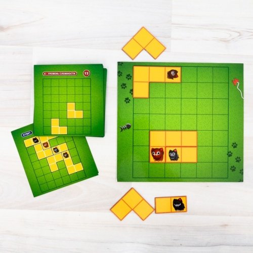 Вытяните карточку, посмотрите, как на ней лежат магнитные детали, и выложите их точно так же на игровом поле. Помогите пушистым котятам собраться вместе!