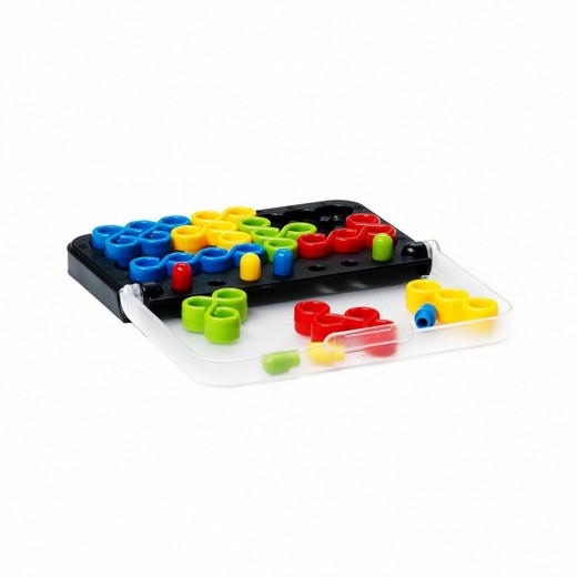 В комплекте 8 разноцветных деталей-загогулин и 7 фишек. Каждая загогулина имеет свою форму и состоит из разного количества петелек (с отверстиями или без). Коробочка представляет собой игровое поле, в верхнем ряду которого есть специальные углубления для хранения фишек. Это очень удобно, ведь в большинстве уровней вам понадобятся не все фишки. Также в упаковке вы найдете книжечку с заданиями и правила на русском языке.