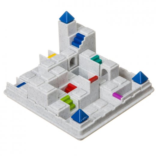 Игра содержит игровую доску с синей прозрачной крышкой, высокую башню, 5 деталей с лестницами, мостами и туннелями, буклет с 60 заданиями и их решениями.