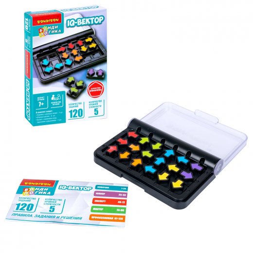 Выберите одно из 120 заданий и повторите указанный в нем рисунок. Для этого поместите подходящие детали на игровое поле, поворачивая их и меняя направления цветных стрелок. Найдите единственное верное решение и проверьте ответ по буклету. Постепенно переходите к более сложным заданиям. Компактная игра IQ ВЕКТОР способствует развитию зрительно-моторной координации движений, логики, креативного мышления, познавательных способностей, цветовосприятия, фантазии и концентрации внимания. Головоломку можно легко взять в дорогу. А еще игра станет отличным подарком для бабушки и дедушки, ведь тренировать память полезно в любом возрасте.
