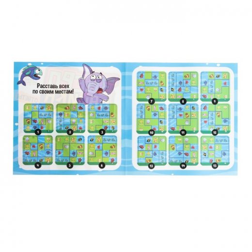 - Чтобы помочь зверятам, решите головоломку с карточки. Выкладывайте фигурки на карточку так, чтобы сухопутные животные оказались на травке, а рыбки и осьминог — в воде.