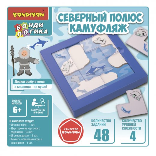 Порадуйте ребенка настольной логической игрой СЕВЕРНЫЙ ПОЛЮС. КАМУФЛЯЖ серии БондиЛогика от Bondibon. Держите рыбу в воде, а медведя – на суше!