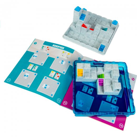 В набор входят: игровое поле, 6 игровых деталей, буклет с правилами игры, заданиями и решениями.