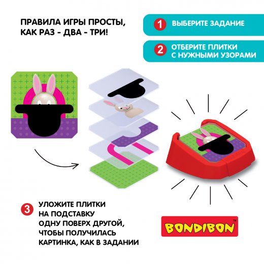 Выберите одно из 72 заданий. Отбирайте необходимые для композиции плитки и укладывайте их одну поверх другой на подставку. Вы нашли правильное решение, если изображение на плитках соответствует заданию. Постепенно переходите на более сложные уровни. Увлекательная игра от Бондибон способствует развитию восприятия цвета, формы, величины, зрительно-моторной координации движений, мелкой моторики, памяти, внимания, воображения, пространственного и логического мышления.