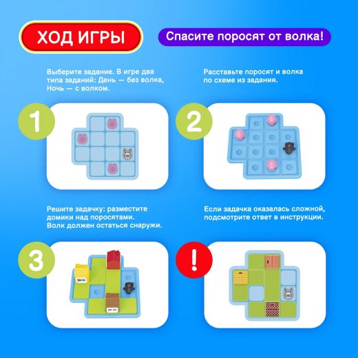Задача игрока — разместить детали головоломки на игровом поле так, чтобы поросята оказались в домиках и спаслись от волка.