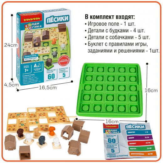 Головоломка в виде полянки с будками и щенками увлечет младших школьников, подростков и даже взрослых на долгие часы! Настольная логическая игра ПЕСИКИ серии БондиЛогики от Bondibon содержит 60 увлекательных заданий, построенных по принципу от простого к сложному.