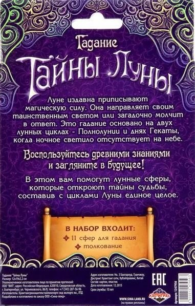 В набор входят 2 большие лунные сферы и 9 маленьких. На одной сфере изображена Луна, а на второй — богиня Геката, имеющая власть над силами тьмы. Возьмите любую чашку, поместите в неё сферы, задав свой вопрос, встряхните их и бросьте на стол. Обратите внимание, как расположились маленькие лунные сферы — именно они ответят на ваши вопросы. Прочтите в толковании, что приготовила Судьба. Доверьтесь таинственному свету Луны!