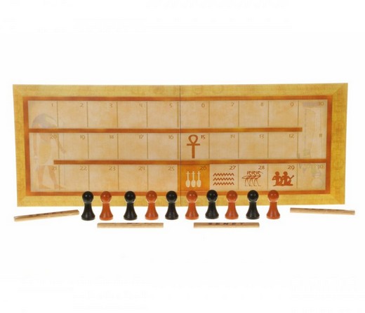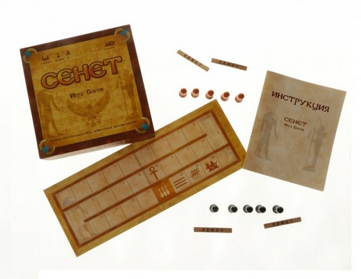 Настольная игра Сенет от компании Brainbox представляет собой расчерченное поле прямоугольной формы. Кидая вместо игральных костей специальные палочки, соперники передвигают свои пешки. Отличительная черта этой игры заключается в том, чтобы не сохранить, а избавиться от всех фишек. В комплект также входит книжка, в которой изложены правила, а также некоторые древнеегипетские мифы, что понравится и детям, и взрослым.