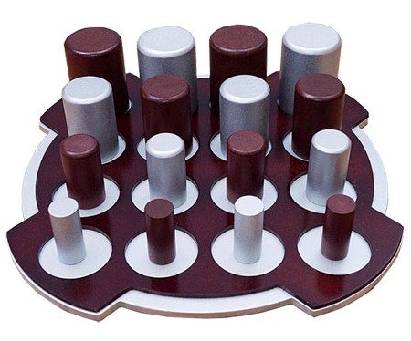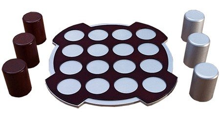 Состав: игровое поле с 16 ячейками, правила игры, 24 деревянные фигуры: 12 светлых и 12 темных.