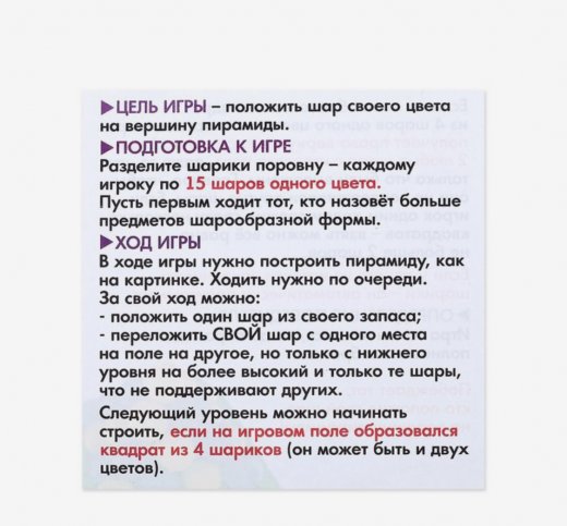 У каждого игрока есть 15 шаров одного цвета. Выкладывая их по одному на игровом поле, вы должны построить пирамиду. Чтобы вы выиграли, именно ваш шар должен оказаться на вершине. Продумывайте стратегию, используйте хитрые ходы, и именно вы станете повелителем пирамиды!