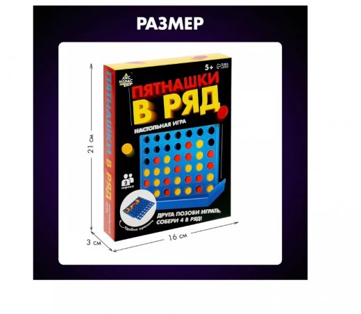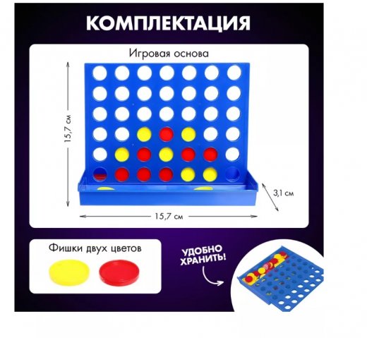 Комплектация: Игровая основа. 44 фишки диаметром 2,5 см: 22 желтых, 22 красных.