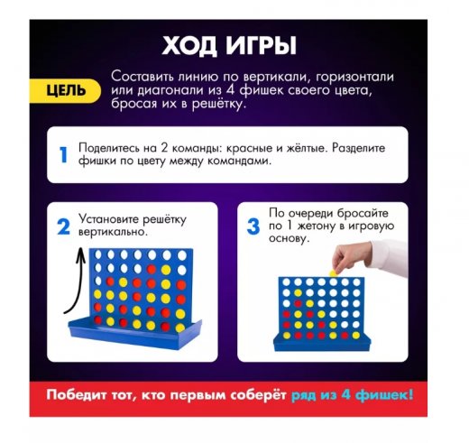 Подготовка к игре: 1. Разделите фишки по цвету между игроками. 2. Установите решётку вертикально на игровую основу. Как играть?адача каждого игрока - собрать линию из 4 фишек своего цвета, бросая их в решётку. 1. Собирайте линию вертикально, горизонтально или по диагонали. 2. Создавайте препятствия для соперника и следите за тем, чтобы он вас не опередил. 3. Побеждает игрок, который первым соберёт линию из 4 своих фишек.