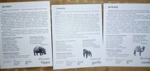 По таким карточкам можно составлять рассказы или попросить ребенка классифицировать животных на хищников и травоядных, по величине и т.д. В общем игр можно придумать огромное множество. Карточки очень яркие и красочные, поэтому без труда привлекут внимание детей. Кроме того дети узнают много подробностей о животных – в наборе имеются довольно подробные описания и прочая интересная информация.