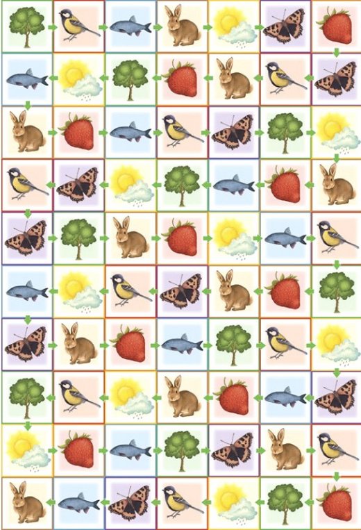 2)Игровое поле можно использовать для развития внимания и памяти. Предложите ребенку найти все деревья (все ягоды, всех бабочек, всех рыбок и т.д.). Если играет несколько детей, выигрывает тот, кто найдет все свои значки быстрее других и без ошибок. Искать нужно по очереди, время можно засекать по секундомеру или часам с секундной стрелкой. Можно предложить ребенку запомнить значки в каждом ряду, а затем назвать их по памяти.