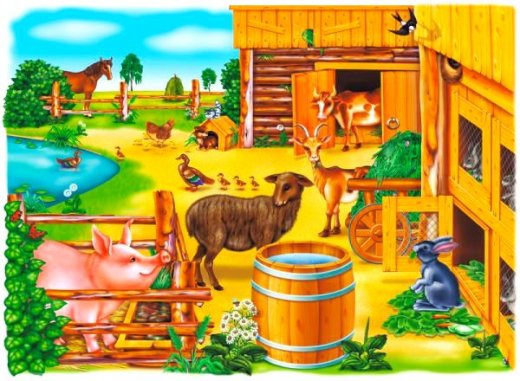 С помощью большой картины с изображением деревенского двора, можно тренировать внимание, учить ребенка отвечать на вопросы по картине, а со старшими детьми и составлять по ней рассказ. Попросите малыша найти на большой картине домашних животных и назвать их. Задавайте как можно больше вопросов: «Где живет свинка?», «Что делает лошадка?», «Сколько уточки утят?» и т.д.