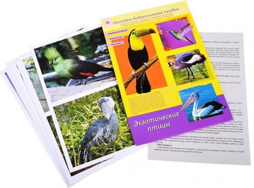 Дидактическое пособие Экзотические птицы – представляет собой набор дидактических карточек, который позволит детям поближе познакомиться с некоторыми экзотическими птицами, узнать о том, как они выглядят, расскажет об их повадках, образе жизни, особенностях поведения и питания. Замечательно выполненные иллюстрации помогут ребёнку лучше представить себе ту или иную птицу.