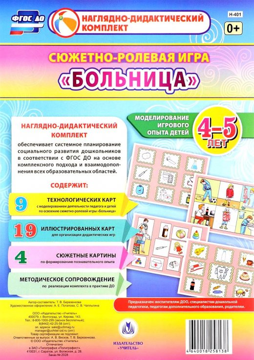 Сюжетно ролевая игра Больница – включает в себя 9 технологических карт, позволяющих комплексно, целостно и последовательно планировать образовательную деятельность по обогащению социального опыта детей 4-5 лет на основе содержания сюжетно-ролевой игры "Больница" в течение учебного года. Представлены также иллюстрированные разрезные карты и красочные сюжетные рисунки (23) для организации бесед, наблюдений, составления рассказов, дидактических игр обучающего и развивающего назначения, соответствующие теме.