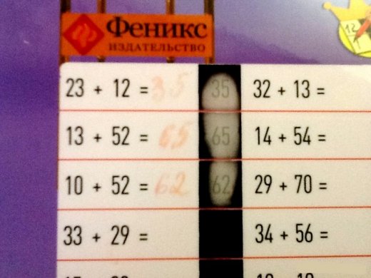 Таблицы сложение большие числа – представляет собой двухсторонний ламинированный плакат. Результат примера можно писать на самой таблице, а чтобы проверить правильность вставленной цифры потрите темную область рядом с примером и вам проявится правильное решение. На каждой стороне по 40 примеров (5 в строке, 8 строчек), примеры не повторяются. В строчках оставлено место для ответа, колонки разделяются черными квадратами - чувствительной к нагреву пленкой. Чтобы сверить ответ, написанный фломастером на ламинированной поверхности, надо или потереть черный квадрат, или просто держать некоторое время палец на черной пленке: на высветившемся отпечатке проступят цифры правильного ответа. Фломастер легко стирается, квадраты с правильными ответами через секунд десять снова становятся черными. На страницах забавные картинки - мальчик-рыцарь и девочка-фея, короны, туфельки, книжечки, листики. Таблицу приятно держать в руке.