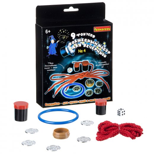 Фокусы от Bondibon 9 фокусов для вечеринки №4 – это замечательный подарок для любителя волшебства и магии. Волшебный набор для вечеринок поможет весело провести время во время любой встречи друзей и семейного досуга. Дети любят смотреть, когда им показывают фокусы. А ещё больше любят их показывать самостоятельно. Устрой настоящее шоу для друзей. Удиви и восхити их. Продемонстрируй фокусы, но сначала как следует, потренируйся. С волшебным набором для вечеринки №4 начинающий волшебник сможет показать 9 удивительных фокусов: Пропавший узел, Волшебный кубик, Трюк с кольцом, Бегающие точки, Фокус с монетами, Три веревки, Завязываем узел одной рукой, Волшебный узел, Загадочный узел.