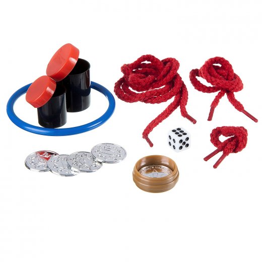 Состав набора: игральный кубик, маленький цилиндр с крышкой, большой цилиндр с крышкой, верёвки, 5 пластиковых монет, контейнер, кольцо, инструкция.