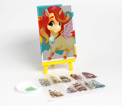 Состав набора: картина с клейкой основой, мольберт, карандаш-стилус, клеевая подушечка, тарелочка, стразы.