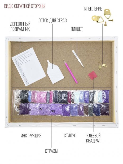 Состав набора: холст на подрамнике с клеевой основой и защитной пленкой, пластиковый лоток для страз, комплект акриловых страз, стилус, пинцет, набор для крепления на стену, галлерта, инструкция.
