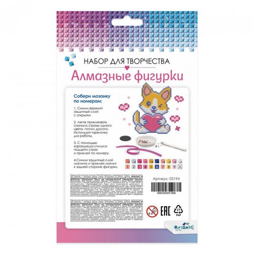 В наборе: фигурка с клеевой основой, карандаш-стилус, тарелочка, стразы, магнит, ленточка.