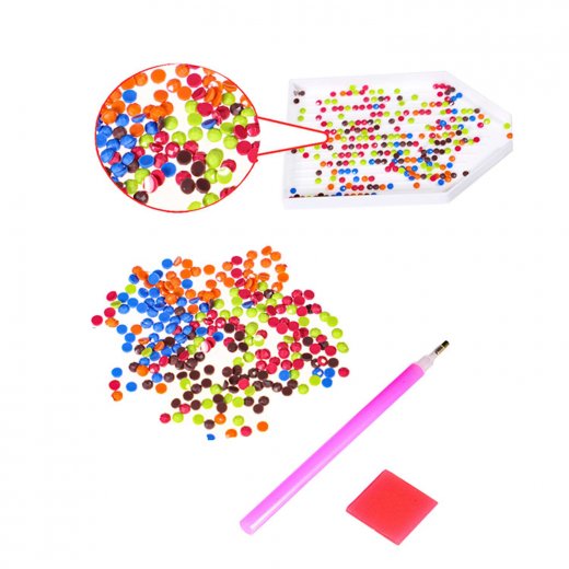 Состав набора: самоклеящаяся основа с подрамником размером 30x40 см, стразы, контейнер для страз, карандаш-стилус, клеевая подушка, крепеж, схема.