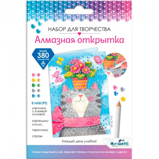 Комплектация: открытка с клеевой основой, карандаш-стилус, стразы, тарелочка