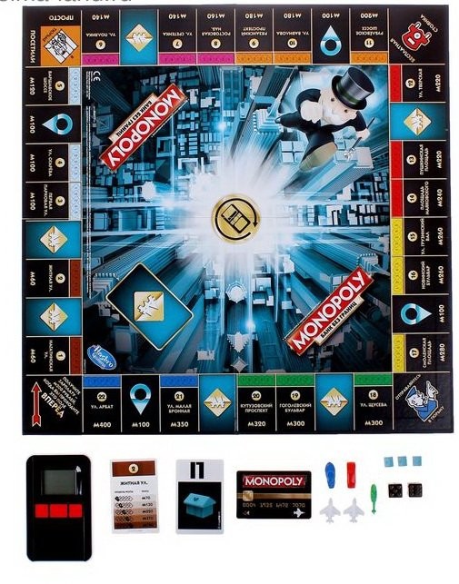 Участники по очереди кидают кубик и передвигают фишку на выпавшее количество очков. Остановившись на ячейке, покупайте новую недвижимость и увеличивайте свой капитал. Влияйте на рынок картами «События» и разоряйте конкурентов. Теперь все финансовые операции легко проводить с помощью банковских карт и специального устройства. Победителем становится игрок, который не обанкротился.