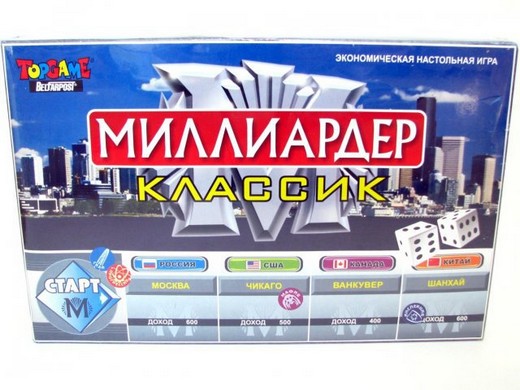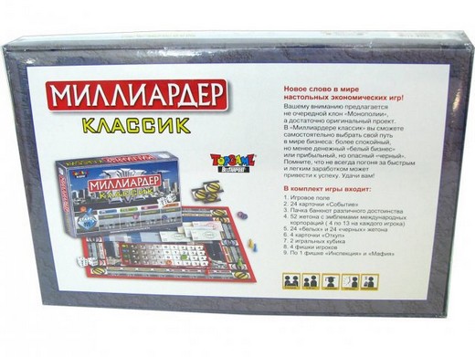 Вам может показаться, что настольная игра «Миллиардер Классик» похожа на Монополию. Но в основном игра полностью оригинальна. Здесь игроки осознанно выбирают путь по которому будут строить свой бизнес. Можно идти честным и проверенным путем, а можно рискнуть и заиметь черный бизнес. В любом случае прибыть от предприятий будет только при грамотном подходе игроков.