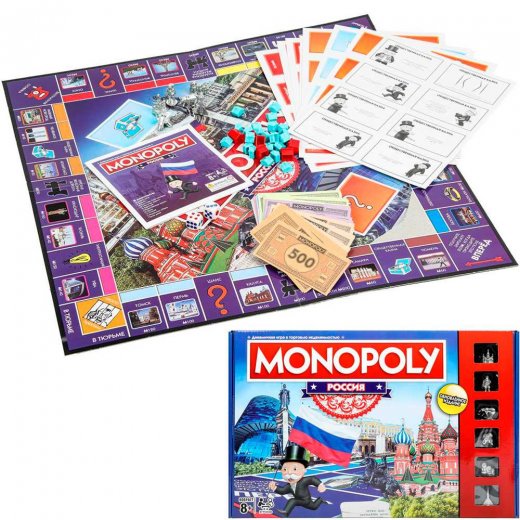 Комплектация: игровое поле, 6 фишек, 28 карточек собственника, 16 карточек шанса, 16 карточек общественной казны, 32 дома, 12 отелей, 2 игральных кубика, игровые деньги, правила