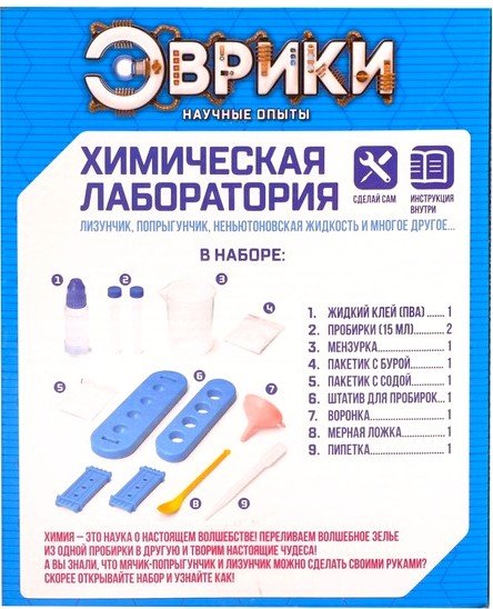 Научные опыты Эврики Химическая лаборатория – это замечательный подарок для любопытного, развивающегося разума, который стремится познать что-то новое. С набором торговой марки «Эврики» ребёнок создаст собственную химическую лабораторию и с помощью жидкого клея, соды и буры изготовит лизуна, попрыгунчика или неньютоновскую жидкость.