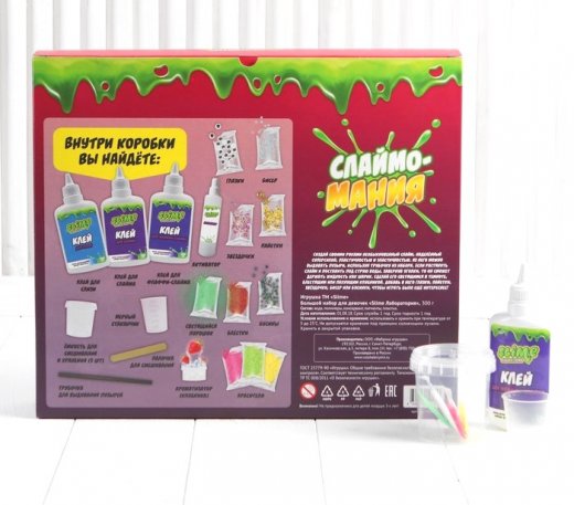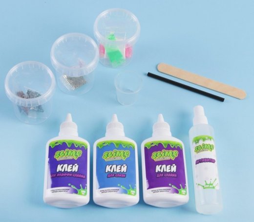 Состав набора: клей для слайма, клей для флаффи – слайма, клей для слизи, глазки, пайетки, бисер, звездочки, светящийся порошок, блестки, бусины, емкость для смешивания и хранения, активатор, стаканчик, палочка, трубочка для выдувания пузырей, ароматизатор клубника, красители.