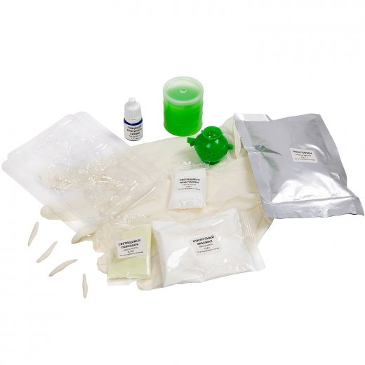 Состав: пакетик пластилина, банка слизи, пакетик светящихся кристаллов, 1 пакетик кукурузного крахмала, форма для изготовления зомби, 1 форма для изготовления пластикового глаза, пакетик светящегося порошка, 4 гелиевых червячка, инструкция.