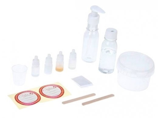 Состав набора: ароматизаторы, натуральный экстракт ромашки, жидкая основа, замутнитель, ёмкость для перемешивания, палочки для перемешивания, перчатки, 2 флакона для шампуня, мерный стакан, наклейки, инструкция.