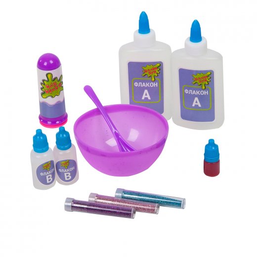 Состав набора: основной раствор 2 шт., контактный раствор 2 шт., красители 3 шт., флакон с блестками 3 шт., ложка, колба, миска, инструкция.