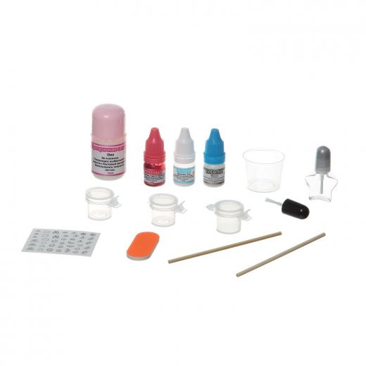 Состав набора: фотохромные стикеры для ногтей, средство для создания мерцающего эффекта, прозрачное акриловое покрытие, стаканчик, палочки для смешивания, дополнительная кисточка, красный и белый краситель, баночки для проведения экспериментов, бутылочка с кисточкой, буфер и пилка, красочная инструкция.